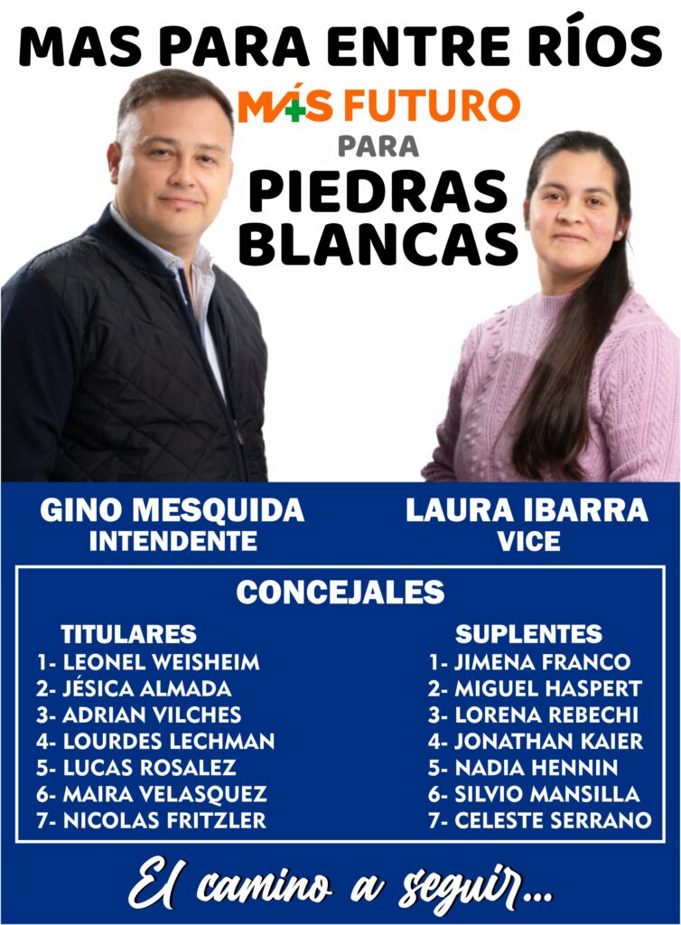 Dando cumplimiento con lo que dicta la Ley Electoral, el espacio Político que lidera Gino Mesquida oficializó la lista de cara a las próximas elecciones en el Municipio de Piedras Blancas. Como lo había anunciado con anterioridad la Prof. Laura Ibarra será su compañera de fórmula mientras que el actual Vice Presidente de la Unidad Básica Local Leonel Weisheim encabeza la lista de Concejales; la Lic en Enfermeria Jésica Almada, el actual Vice Intendente Adrian Vilches y Lourdes Lechman completan los cuatro primeros lugares de la lista de Concejales.