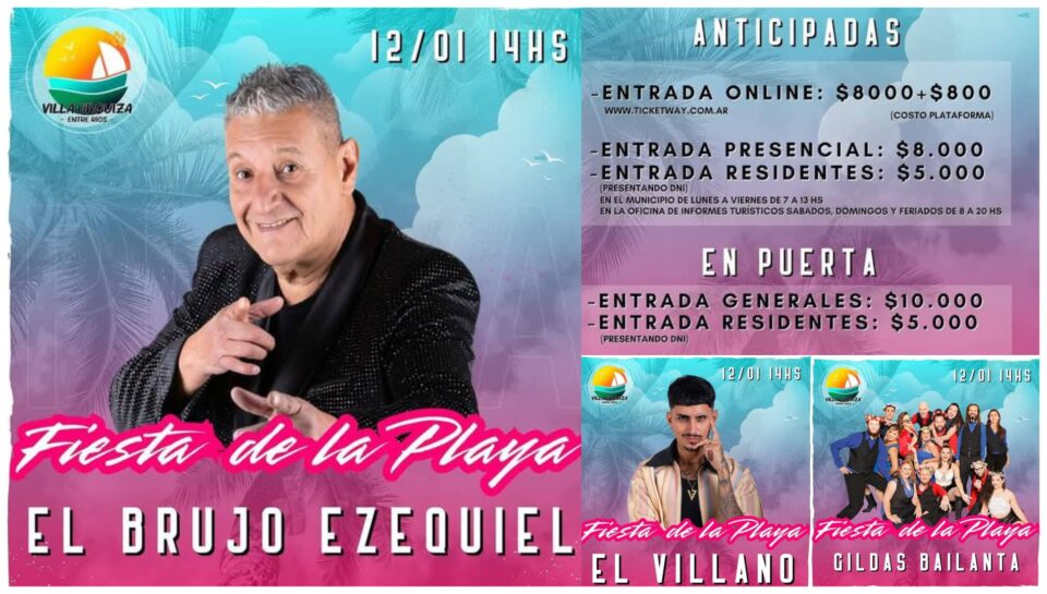 El proximo Domingo 12 de Enero se llevará a cabo la tradicional «Fiesta de la Playa» en la pintorezca Villa Urquiza, el «Brujo» Ezequiel, el Villano y Las Gildas serán los encargados de ponerle ritmo a la fiesta.