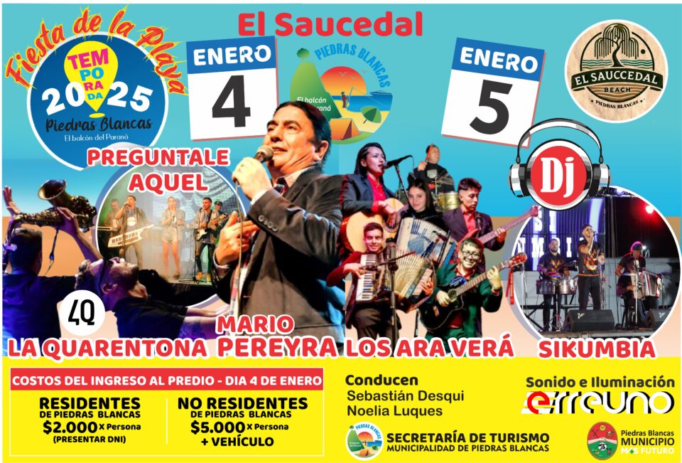La Secretaría de Turismo de la Municipalidad de Piedras Blancas, dio a conocer que los días 4 y 5 de Enero se llevará a cabo la tradicional «Fiesta de la Playa». La organización dio a conocer la grilla de artista para ambos días, donde se destaca el santafesino Mario Pereyra, que estará cerrando la primer noche de este gran evento que se desarrolla en Playa El Saucedal.