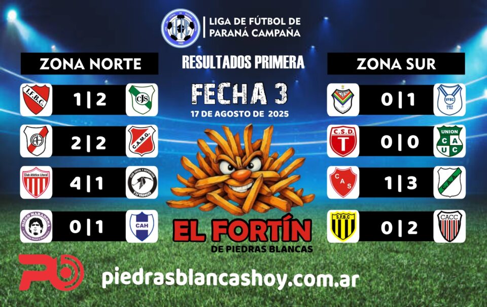 Este domingo 17 de agosto se jugó la tercera fecha del Torneo Clausura, de Primera división masculina, de la Liga de Fútbol de Paraná Campaña. Litoral derroto categóricamente al Deportivo Tuyango por 4 a 1 y fue el único equipo local que ganó. Cañadita y Viale FBC se quedaron con los clásicos de la tarde. A continuación todos los resultados de los ocho partidos.