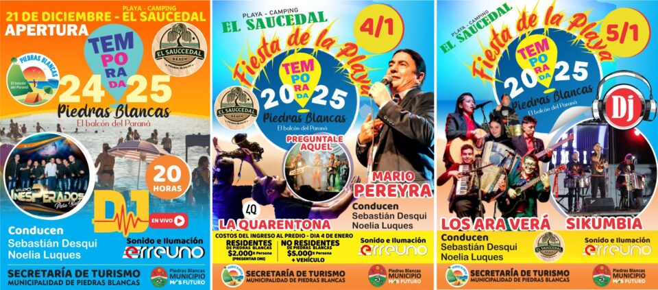 La Secretaría de Turismo de la Municipalidad de Piedras Blancas, dio a conocer que este 21 de Diciembre se abre la Temporada 24/25 y que los días 4 y 5 de Enero se llevará a cabo la tradicional «Fiesta de la Playa». Ambos eventos se realizarán en la Playa – Camping «El Saucedal».