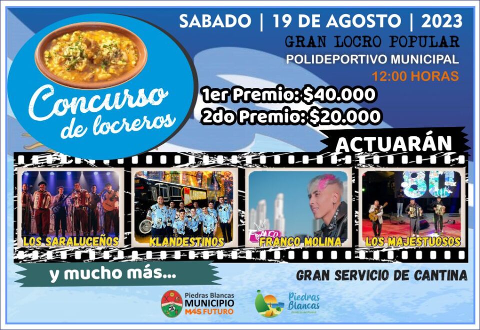 La Municipalidad de Piedras Blancas reprogramó la fecha de realización de una nueva edición del concurso de locreros, la misma fue suspendida el sábado 8 de julio por motivos de público conocimiento, el evento se realizará el próximo 19 de Agosto en el Polideportivo Municipal “Fabio Goró”. Allí se vivirá esta tradicional fiesta, que reúne la participación de sus habitantes, shows artísticos, gastronomía típica y la idiosincrasia cultural de la localidad.
