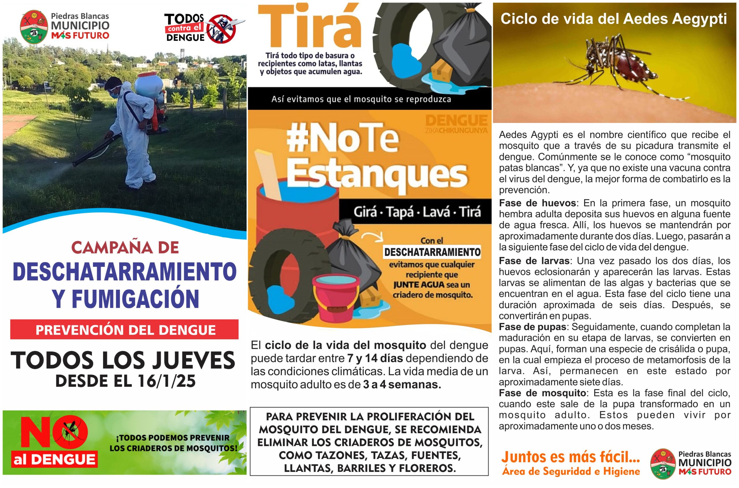 La Municipalidad de Piedras Blancas, a través de las Áreas de Seguridad e Higiene Laboral y la de Infraestructura Urbana pondrá en marcha una campaña de deschatarramiento y fumigación en toda la localidad. La campaña comenzará este jueves 16 de Enero y se llevará adelante periódicamente, los jueves de cada semana.