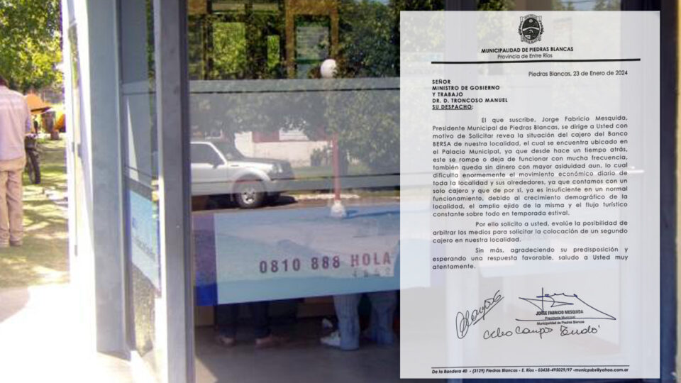 En la misiva el Intendente remarca que «la solicitud de instalar otro cajero automático, se viene realizando hace 1 año atrás ante as autoridades del BERSA, y a la Anterior Gestión del Gobierno provincial, sin tener resultados favorable»