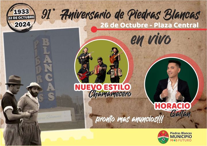 Si bien el Aniversario de Piedras Blancas es el 22 de Octubre, el municipio a través de sus redes sociales anticipo que el Sábado 26 realizará los festejos del 91° Aniversario de la localidad, Horacio Gatan y el Nuevo Estilo Chamamecero formaran parte de la cartelera de artistas que se está armando para esta fecha tan importante para el pueblo minero,