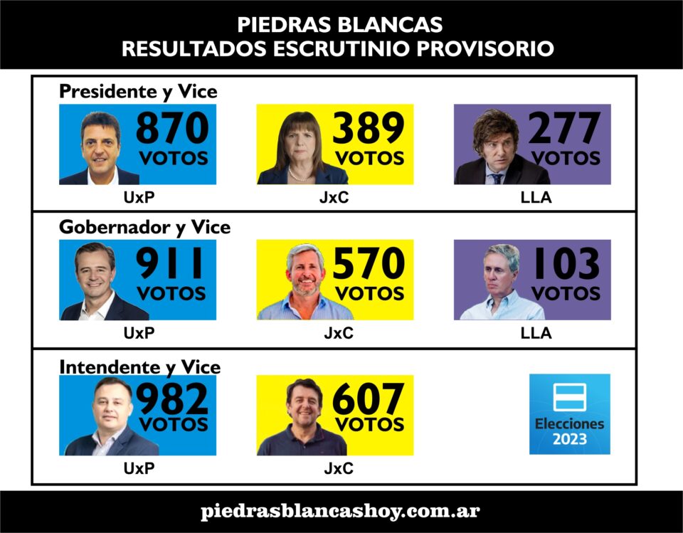 Los resultados arrojados señalan que en la categoría Intendente y Vice el Frente Unión por la Patria, con la candidatura del actual Intendente Fabricio «Gino» Mesquida, obtuvo 982 votos, relegando al segundo lugar al candidato de Ahora Piedras Blancas, Norberto Hauch que sumó 607 votos.