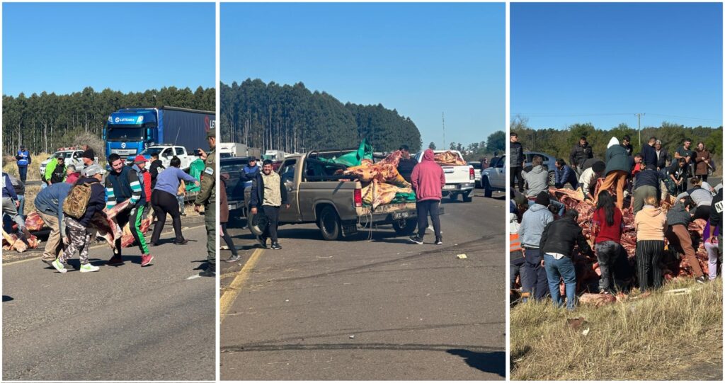 Lo cierto es que, poco tiempo después del accidente, una multitud aprovechó la oportunidad para apropiarse del cargamento desparramado. En las imágenes registradas en la zona, decenas de personas se congregaron en el sitio del vuelco, muchas de ellas a bordo de automóviles y camionetas, a fin de recoger la carne y cargarla en sus vehículos.