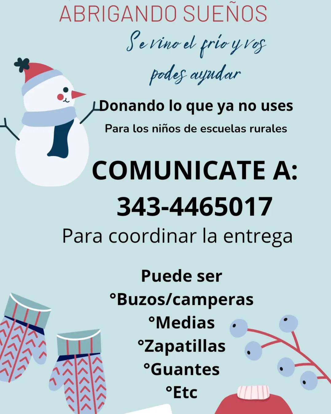 Ante la llegada del frío y la difícil situación social y económica que atraviesa el país, Lourdes Lechman, una vecina de Piedras Blancas, puso en marcha la campaña solidaria «Abrigando Sueños» , campaña que tiene como fin recolectar ropa de abrigo y destinarlas a chicos en situación de vulnerabilidad que asisten a escuelas rurales del ejido de nuestra localidad «sumate a qué los niños de Escuelas Rurales vayan calentitos a clases, todo lo que no uses y este en buen estado sirve» expresa Lourdes en la difusión de la campaña solidaria.