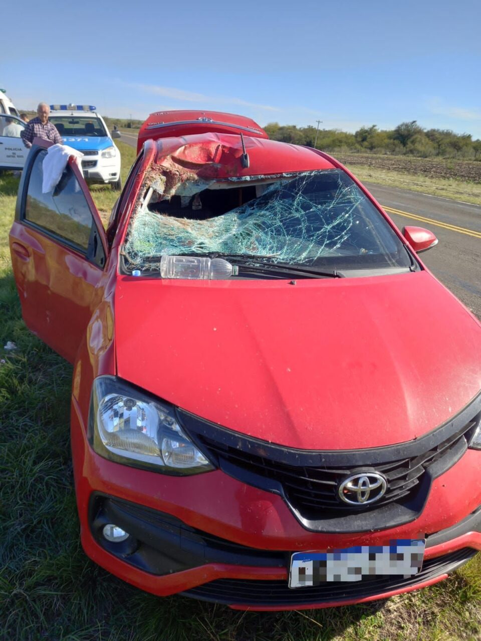 Dos personas que se trasladaban en un Toyota Etios protagonizaron en la tarde de hoy un siniestro vial en la Ruta 12, segun informó la policía se le cruzó un ciervo provocando el accidente.